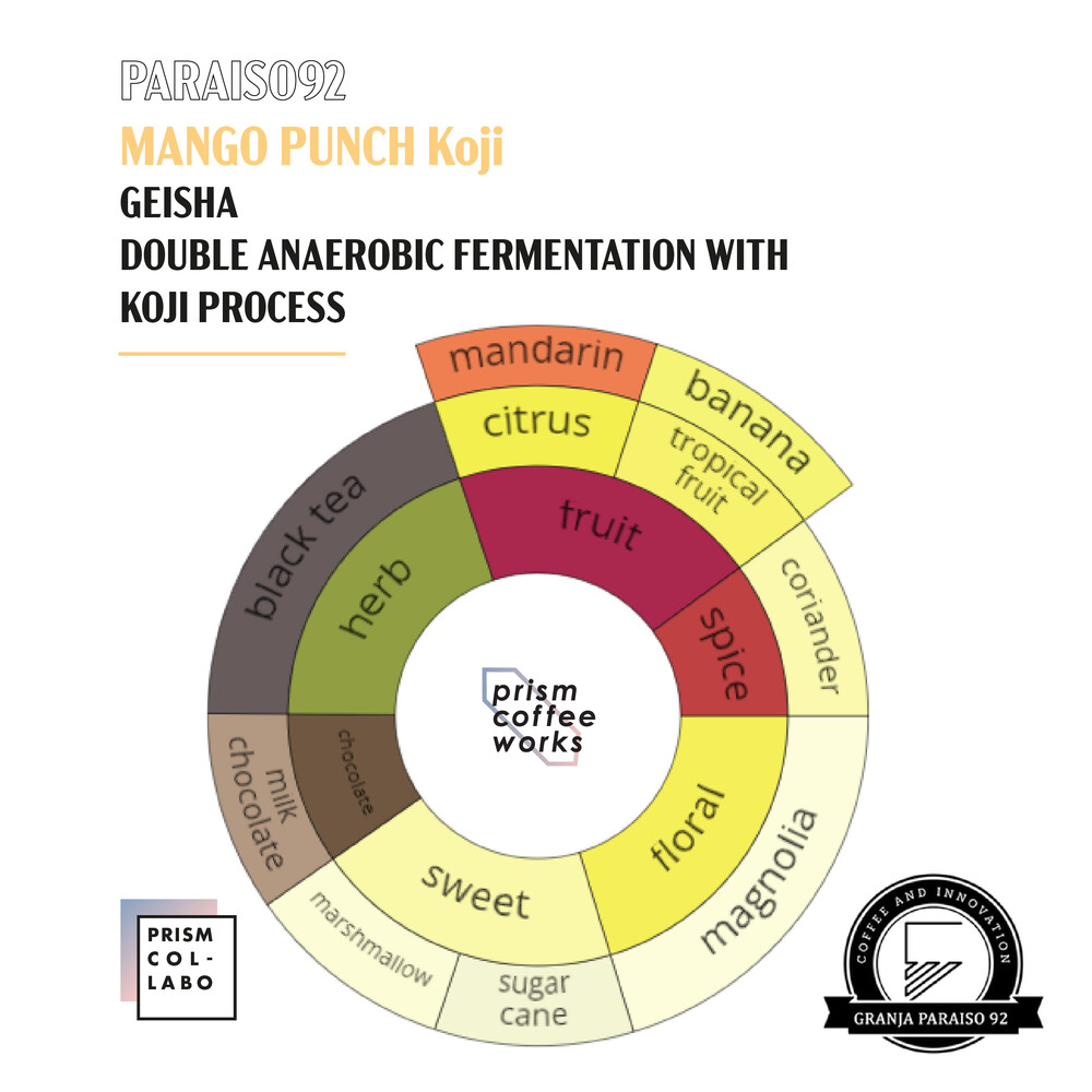열대과일을 넣은 홍차를 연상케 했던 망고펀치 게이샤를 코지(일본 누룩)을 넣어 더욱 녹진하고 향기롭게 만든 커피입니다. 망고펀치의 열대과일 향과 입 안 가득 차는 단 맛, 그리고 매끄러운 질감까지. 현존하는 최첨단의 프로세싱 기술이 빚어낸 새로운 커피, 여러분도 함께 맛 보세요.