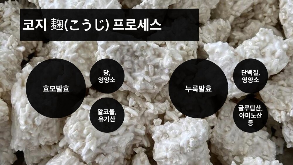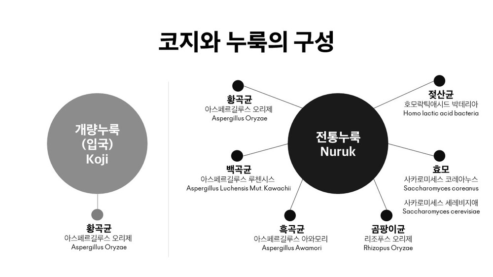 일본 누룩(코지)은 황곡균 한 가지를 접종해 만드는 개량 누룩입니다. 하지만 한국 전통 누룩은 전통 방식 그대로 밥을 짓고 발효해 더욱 다양한 미생물 집단을 가지게 됩니다.