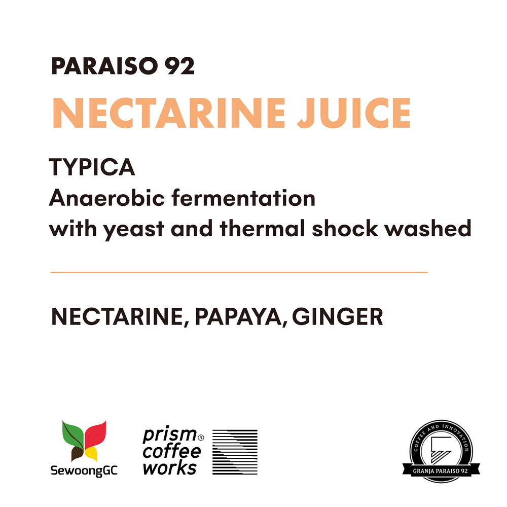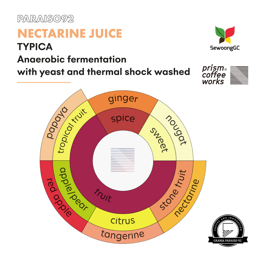 - 컵노트 : 천도복숭아, 파파야, 진저 Nectarine, Papaya, Ginger