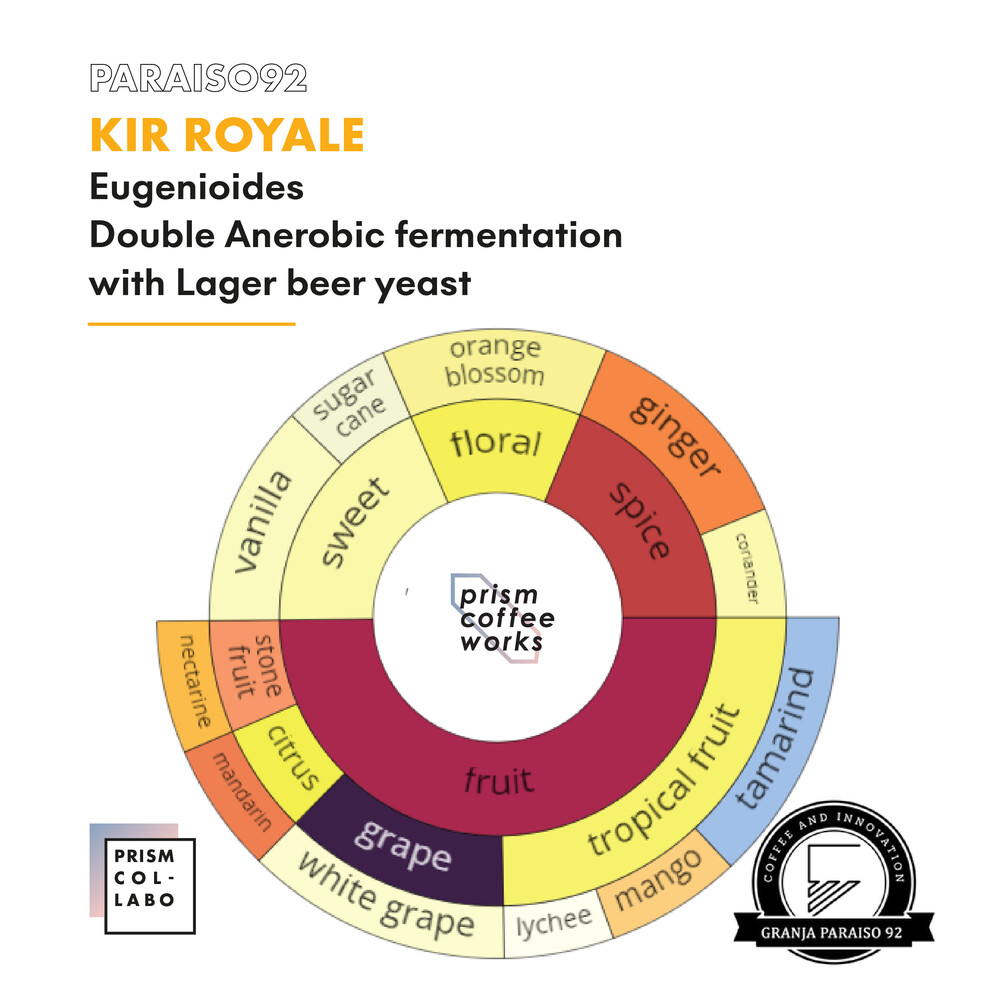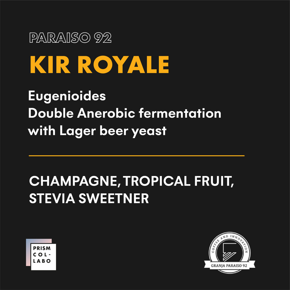 그 중에서도 가장 특별한 커피인 “키르 로얄” 을 소개합니다. 2021 월드 바리스타 챔피언쉽에서 가장 주목받은 아라라비카의 모계종, 유게니오이데스 Eugenioides 에 라거 효모를 넣고 체리 상태에서 한 번, 껍질을 벗겨낸 상태에서 한 번 온도와 pH를 섬세하게 컨트롤 해 발효한 커피입니다.
