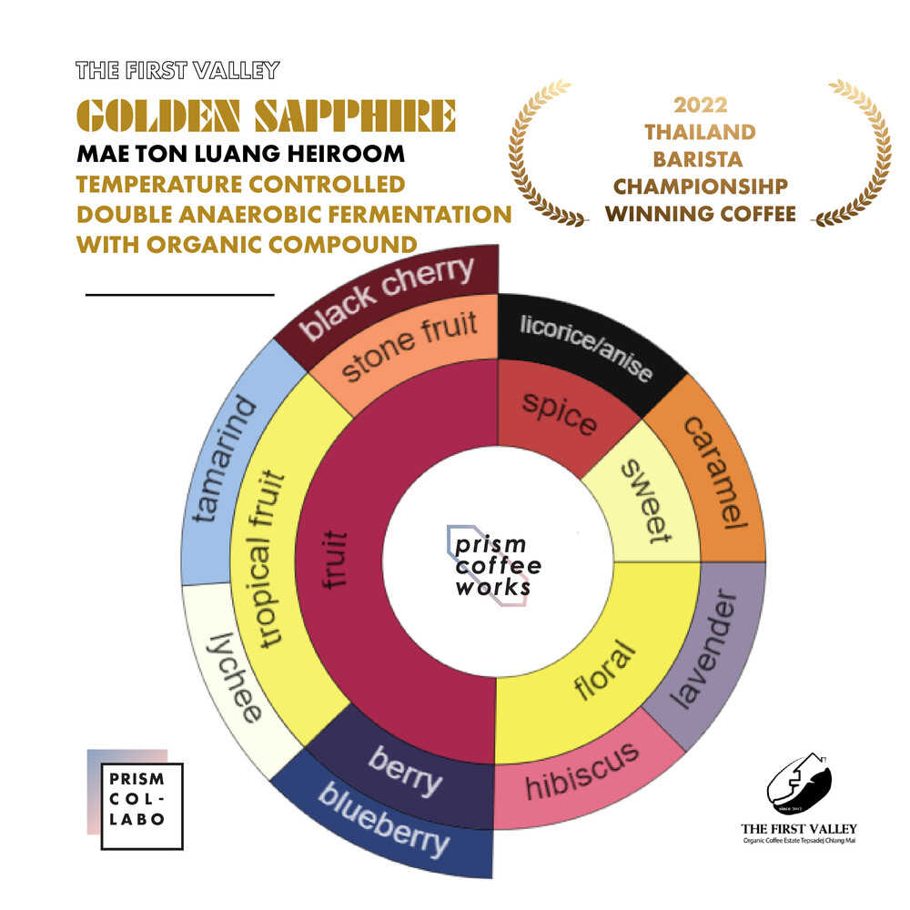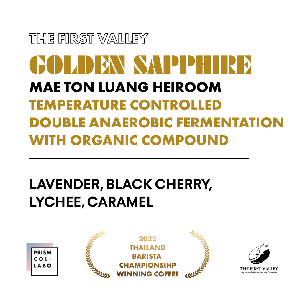"골든 사파이어"는 잘 익은 커피 체리(Heirloom Mae Ton Luang)만을 엄선하여 독특한 가공 방법으로 세심하게 가공합니다.
